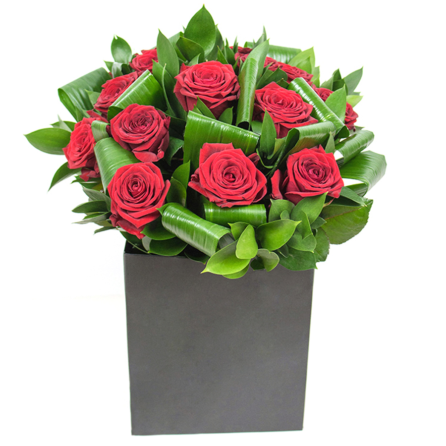 Exquisite Elegance with our beautiful bouquet of vibrant red roses, lush aspidistra leaves, and delicate ruscus. Each bloom is hand-selected to ensure unmatched freshness and quality, creating a uniquely stunning and luxurious arrangement.